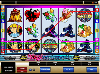 Слот-машина Vinyl Countdown – игровой автомат о неповторимых шестидесятых годах. Эмулятор поможет игрокам окунуться в ту атмосферу за счет удачно подобранных символов – изображения Элвиса, милой девушки, танцующей пары, стильных туфлей тех годов и различных сладостей: бананов с мороженным, вафлей, карамельного десерта и коктейля.